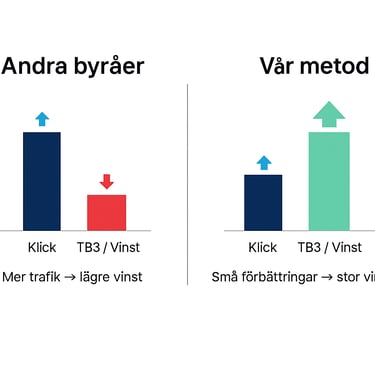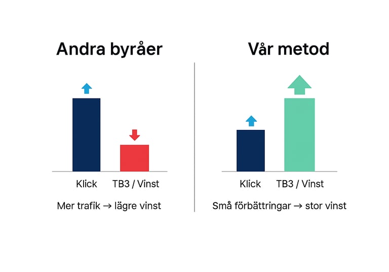 De flesta byråer jagar volym, men små förbättringar i konvertering, snittordervärde och trafik ger ofta större vinst än att köpa mer trafik. En balanserad ökning på 10 % i alla tre komponenter ger minst 35 % högre vinst. Det är därför vi inte optimerar mot ROAS, utan mot TB3 i kronor.